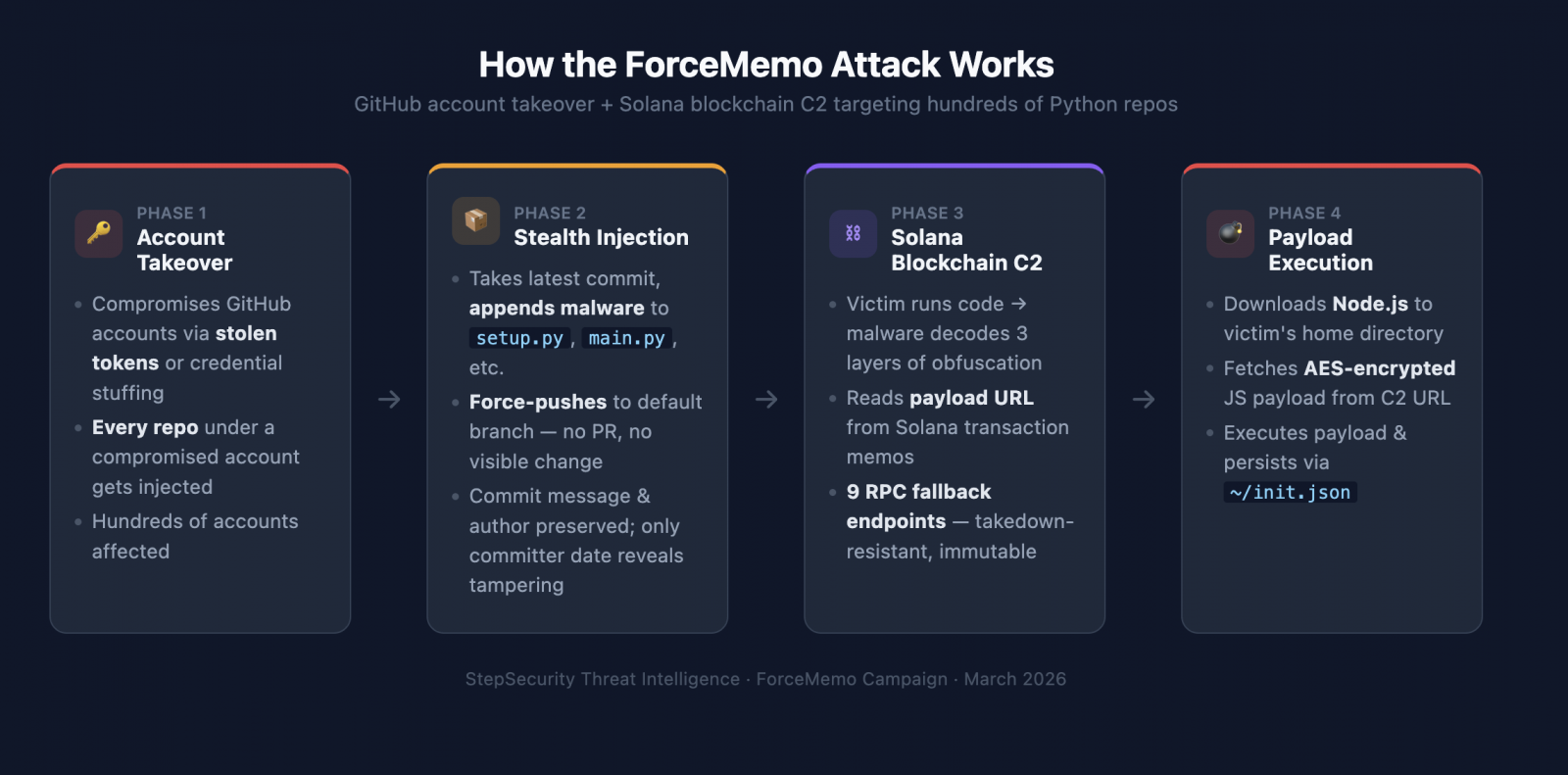 資安公司StepSecurity揭露名為ForceMemo的供應鏈攻擊行動,駭客入侵開發者帳號,已在數百個GitHub上的Python專案植入惡意程式,且攻擊活動仍在持續擴大。這波攻擊最早可追溯至2026年3月8日,攻擊者取得開發者帳號存取權限,對程式庫進行大規模竄改,將惡意程式碼植入多個專案。而這些受害的開發者存在共通點,就是他們的開發環境感染了GlassWorm,攻擊者以此竊得GitHub權杖(Token)而得逞。